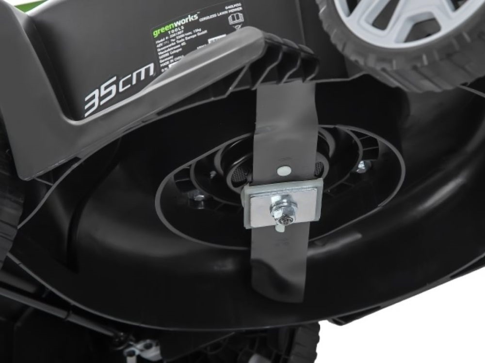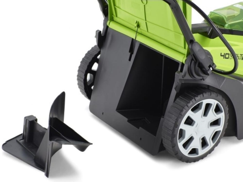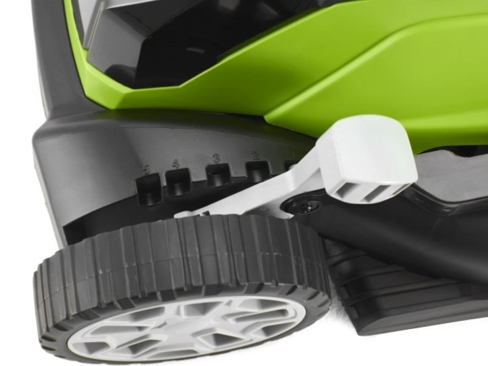 - Ширина кошения составляет 35 см. Пять ступеней регулировки высоты стрижки в диапазоне от 32 до 85 мм. Травосборник объёмом 40 литров, идёт в комплекте вместе с газонокосилкой, изготовлен из прочного материала, прост в обслуживании. Такая конструкция травосборника снижает вес всего агрегата. Так же, газонокосилка GREENWORKS G40LM35К2 укомплектована заглушкой для мульчирования.