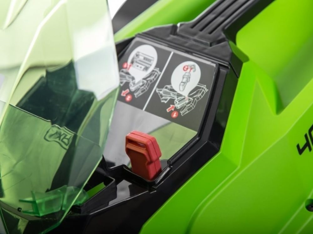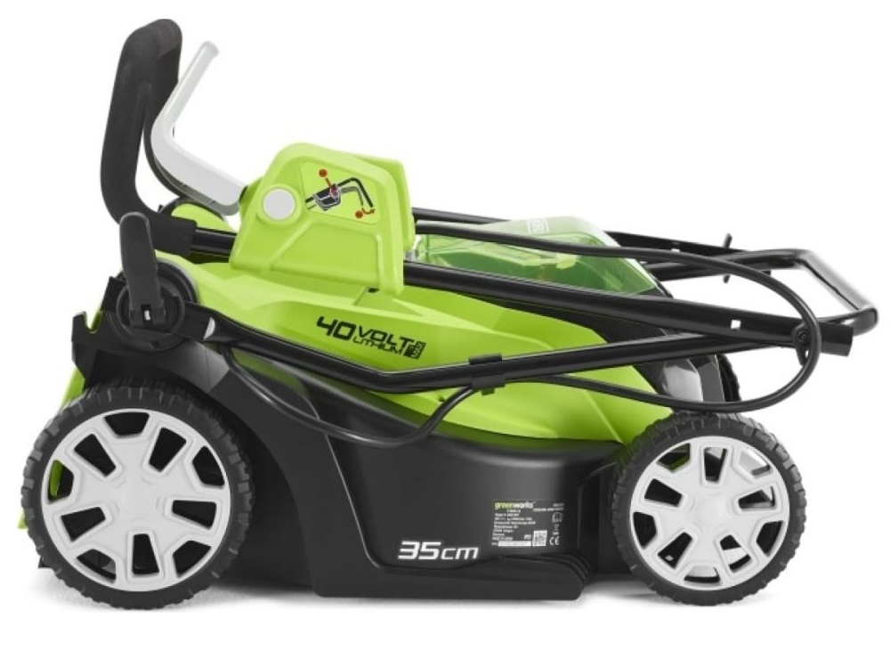 - Эргономичная форма рукоятки данной модели и удобно расположенные органы управления снижают утомляемость во время использования устройства. Рукоятка легко складывается, что обеспечивает беспроблемную транспортировку газонокосилки GREENWORKS G40LM35К2, а так же ее хранение.