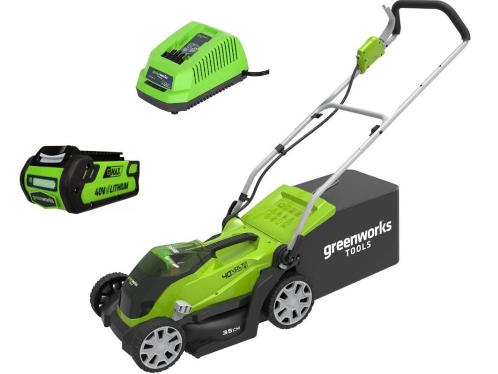 - Аккумуляторная несамоходная газонокосилка GREENWORKS G40LM35К2 - экологически безопасное устройство. Данная модель отличается низким уровнем шума, производительностью и отсутствием вредных выбросов в атмосферу. Надежный электрический двигатель производства GREENWORKS долговечен и надежен. Li-Ion аккумулятор 40В 2Ач и зарядное устройство в комплекте. Возможно использование АКБ соответствующего напряжения любой ёмкости - 2 Ач, 4 Ач, 5 Ач, 8 Ач.