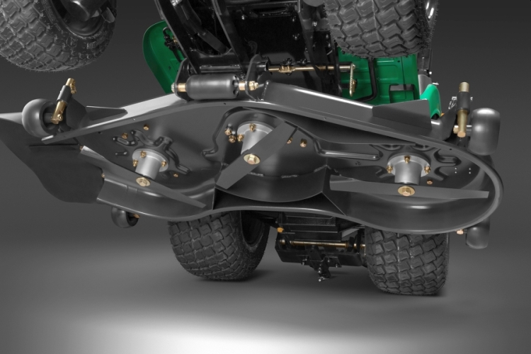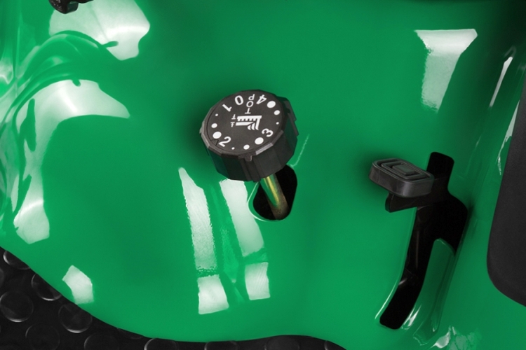 Высота ножей регулируется поворотной ручкой, позволяющей точно выставить нужный уровень стрижки. Подъём и опускание деки производится с помощью отдельного гидравлического привода, активируемого рычагом. Для работ на неровном газоне и исключения скальпирования дерна декой опорные колеса регулируются отдельно. |