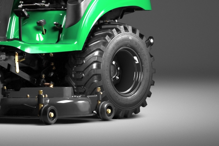 - Трактор укоплектован индустриальными колесами, которые оптимально подходят для перемещения по пересечённой местности, где требуется расчистка территории от травы без особых требований к покрытию. Благодаря более агрессивному рисунку протектора обеспечивается лучшая проходимость при работе на сложном ландшафте.
