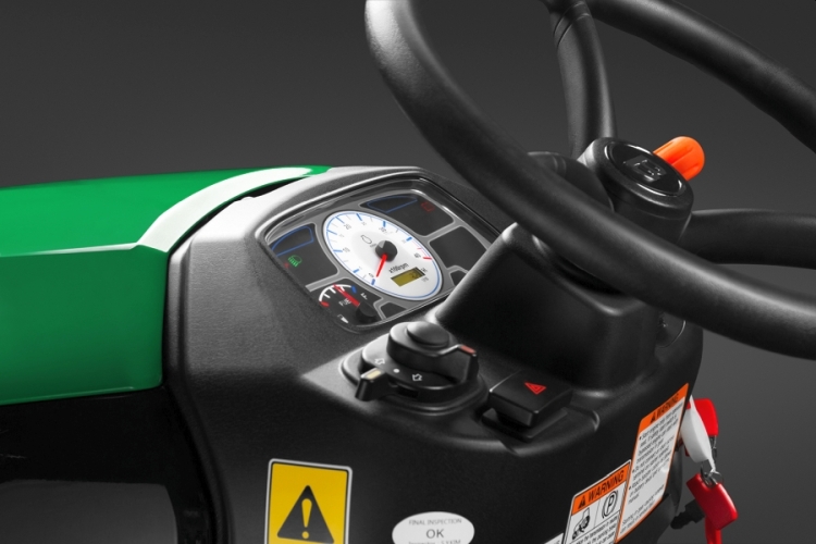 Место оператора устроено так, чтобы было удобно работать продолжительное время. Все органы управления расположены под рукой. На информационной аналоговой панели находится вся необходимая информация: счетчик моточасов, оборотов двигателя, индикатор уровня топлива и включенной деки. |