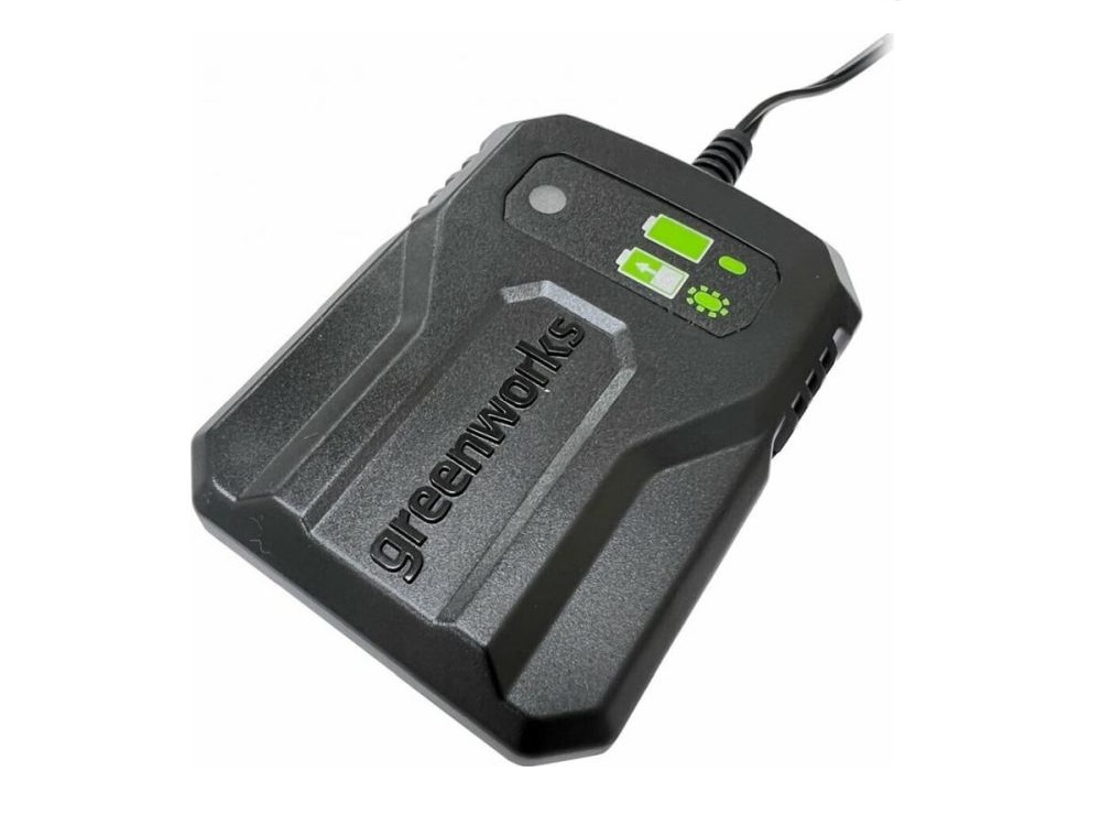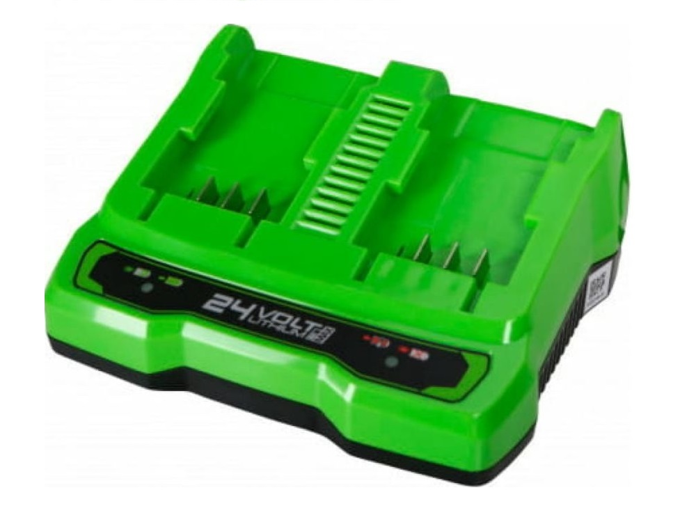 220-240В Зарядное двухместное устройство 24В. Cовместимость с аккумуляторами Greenworks G-24V. Чип для защиты. Индикатор заряда. Максимальный ток заряда 2 А. Время заряда батареи на 2 Ач - 60 мин, на 4 Ач - 120 мин.